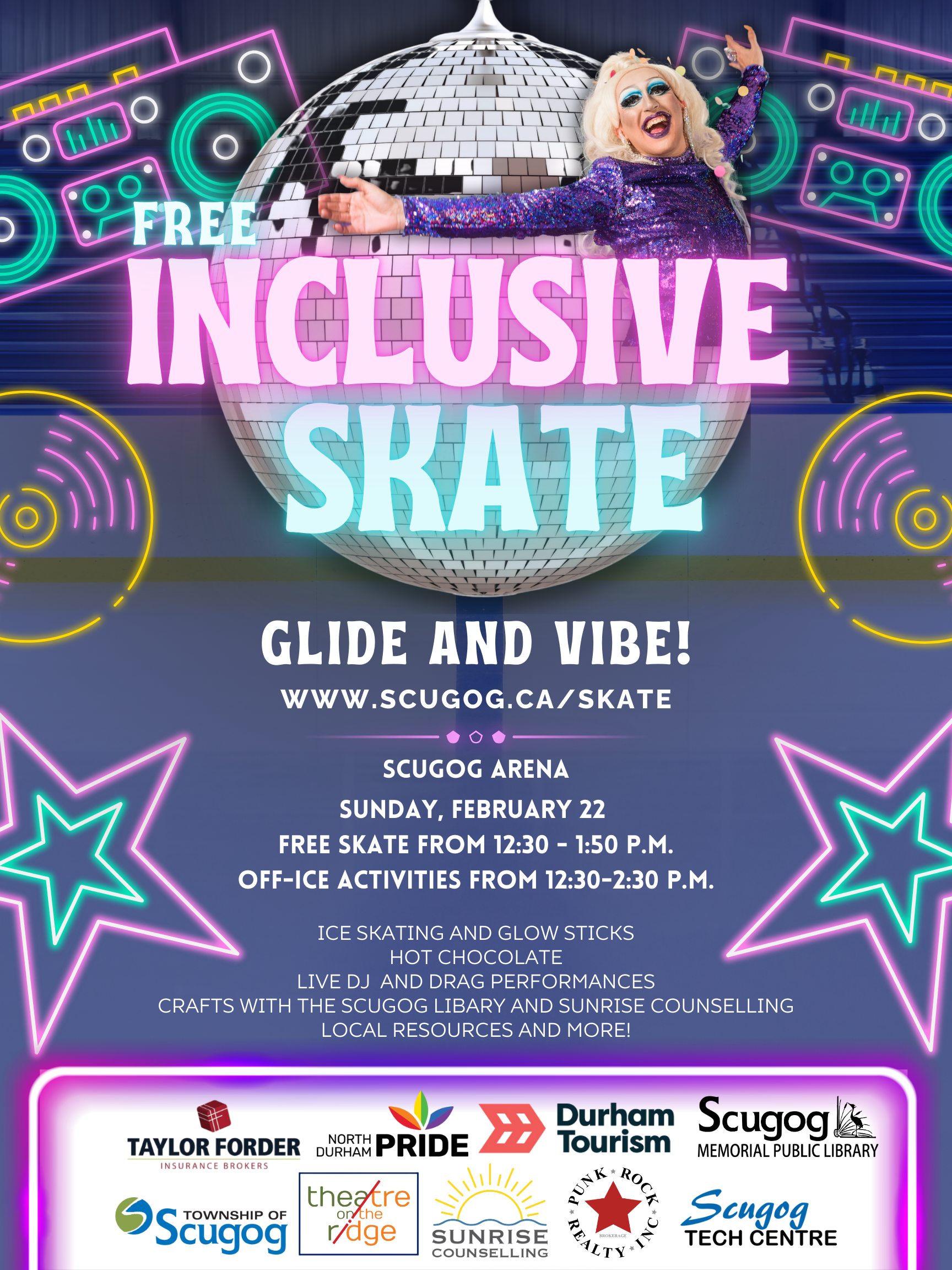 The Township of Scugog in partnership with North Durham Pride is excited to bring back a free and inclusive skate this February at the Scugog Arena. Enjoy a fun free public skate with music, activities and local resources promoting inclusivity of the 2SLGBTQI+ community.